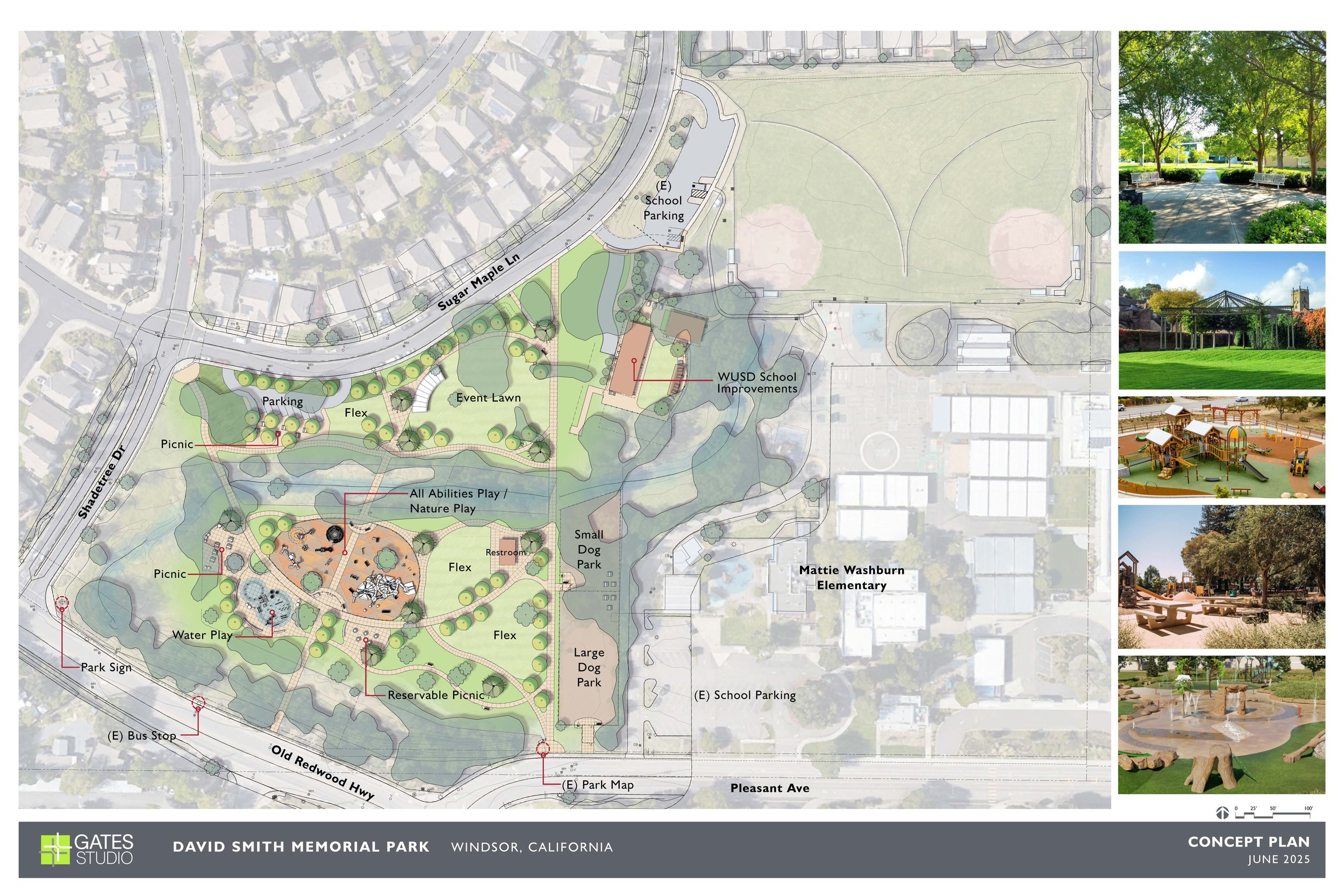 Gates Studio led the design of a long-range vision to transform the 8.5-acre park (formerly known as Pleasant Oak Park) into an inclusive, culturally rich community hub in the town of Windsor. Guided by extensive public engagement, the plan introduces all-abilities and nature play areas, interactive water play, flexible event lawns, shaded picnic spaces, and an enhanced dog park, all connected by accessible pathways and native landscaping. Pomo-inspired play features, interpretive walks, and gathering spaces honor the legacy of Kashia Pomo elder David Smith while celebrating the land’s Indigenous heritage. The Master Plan offers the Town a clear framework to guide future improvements that balance recreation, culture, community, and connection to nature.