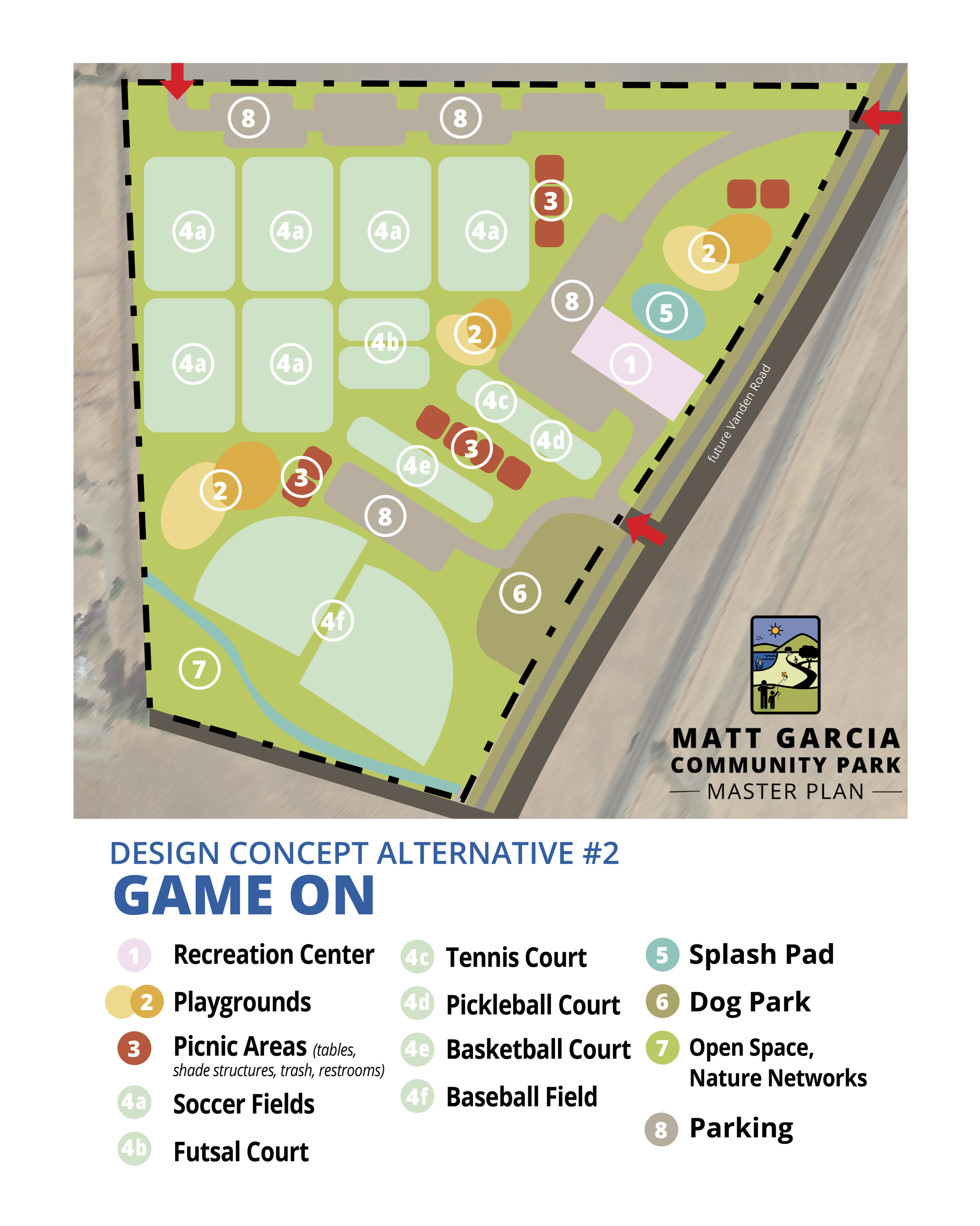 The final Master Plan provides site and community needs assessments, a schematic design, and funding and implementation strategies. Key design features include a recreation center, an inclusive adventure playground, a splash pad, an amphitheater, an all-wheels track, sports courts, and tournament-grade soccer fields, all thoughtfully arranged to support family-friendly use, flexible programming, and long-term community benefit.